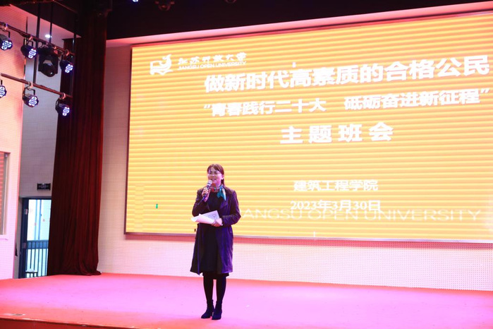 3月30日下午,建筑工程学院以《做新时代高素质的合格公民》为题,在应天校区体艺馆406多功能厅,召开了2023年春学期“开学第一次主题班会”,分享践行党的二十大精神,围绕“爱国、团结、奋斗、科学、互助”五个关键词,通过学生们自编自导自演的情景剧,引导同学们思考如何做新时代高素质的合格公民,如何将“小我”成长融入“大我”奋斗,让“小我”的青春里有“大我”的家国情怀,责任和担当。江苏开放大学党委副书记、副校长金丽霞,建工院党总支书记曹永、副书记徐亚,校学工处、团委负责人、各学院党总支副书记和学工办主任现场观摩,建工院全体辅导员与21级、22级学生代表一起参加了主题班会。
