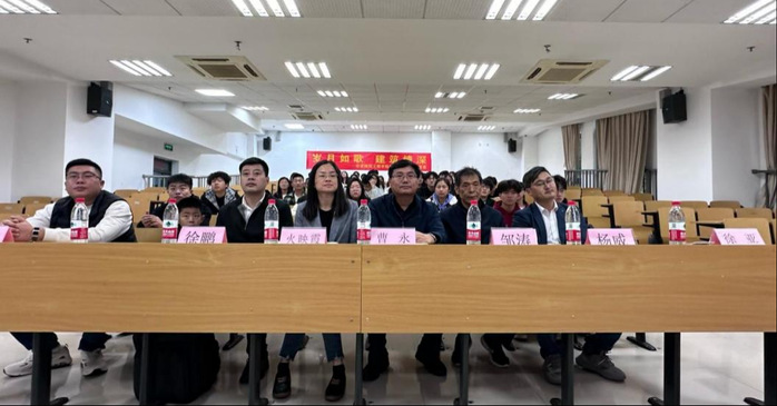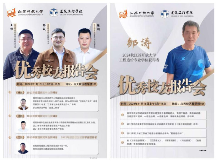 上午9时,优秀校友报告会在教学楼101阶梯教室举行。学院党总支副书记徐亚主持会议,2011至2013年度国家奖学金获得者杨威、徐鹏、王恒,以及2024秋工程造价专业学历学位获得者邹涛应邀出席,与百余名学生代表分享他们的成长故事。
