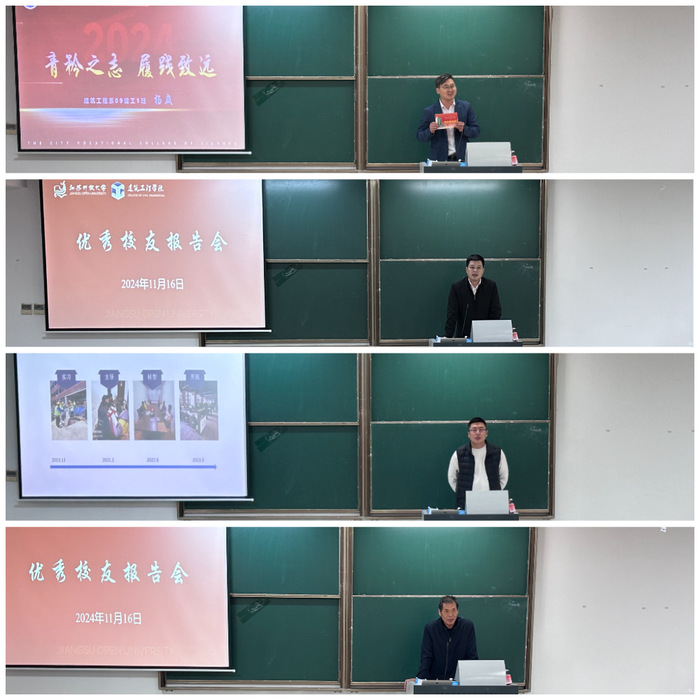 随后,校友们围绕各自的主题,杨威以“青衿之志、履践致远”为题,徐鹏围绕“职业规划与成长”,王恒以“毕业十年遇见当初的自己”,邹涛就“我与江开之缘与建筑行业前景”为题,深情讲述了在校学习的点滴、职业发展的历程以及人生的感悟,鼓励在校学子珍惜时光,勇敢追梦,全面提升自我。徐亚对校友们的无私分享表示感谢,校友们的励志故事和宝贵经验,为在校学子们树立榜样,激发了他们追求卓越的动力。