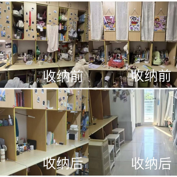 比赛过程中,部分宿舍展现的收纳改造前后对比图,着实令人眼前一亮。收纳前,宿舍内物品散落无序,桌面、床铺乃至各个角落均被各式杂物充斥,使得空间显得局促不堪。然而,经由同学们的巧手整理后,宿舍面貌焕然一新,呈现出一派井然有序的景象。床铺平整整洁,被子叠放整齐,衣物有序挂放或收纳进衣柜;桌面上的书籍、文具等分门别类,摆放整齐;地面干净清爽,鞋子在鞋架上排列的井井有条;杂物也被巧妙地收纳进各种盒子、篮子中,放置在合适的位置。这些对比鲜明的照片,不仅生动展现了收纳对于宿舍环境的显著改善,更彰显了同学们在收纳艺术上的独到匠心与非凡创意。