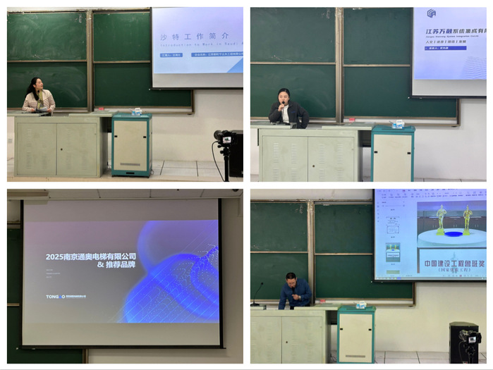 随后,四家企业通过视频展播、高管宣讲、互动答疑等形式展开推介,校团委同步开启直播带岗,扩大活动辐射面。南京沧溪公司聚焦“一带一路”建设,介绍了沙特项目的人员动迁机制、海外福利保障及职业发展通道,释放基建管理、涉外工作等复合型岗位;江苏万融系统公司作为实验室智能配套领域头部企业,重点推介了应用人才孵化计划;南京华荣建设集团推出了测量员-项目经理阶梯式实习培养体系;南京通奥电梯现场发布20名维保技师定向招聘计划,承诺为录用者提供特种设备操作资格认证支持。现场学生就跨国项目晋升、建筑技能证书要求等问题积极提问、气氛热烈。