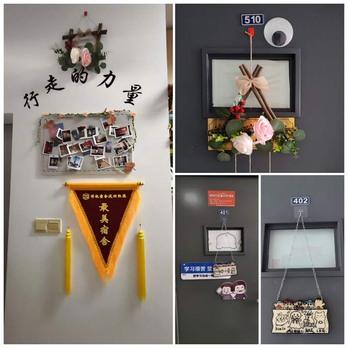 本次活动首项内容为“宿舍门牌个性制作展示”。学院鼓励学生以专业特色、青春活力为主题设计宿舍门牌,共有15间宿舍参与。同学们充分发挥创意,将建筑制图、手绘漫画、励志标语等元素融入设计中。有的宿舍以“匠馨花语”为名,展示工匠精神专业特色;有的宿舍用卡通形象和团队合影传递温馨氛围。曹永书记在参观时表示:“个性化门牌不仅是宿舍文化的窗口,更展现了建工学子的创新思维和凝聚力,希望这种积极的文化创意在全院宿舍推广。”