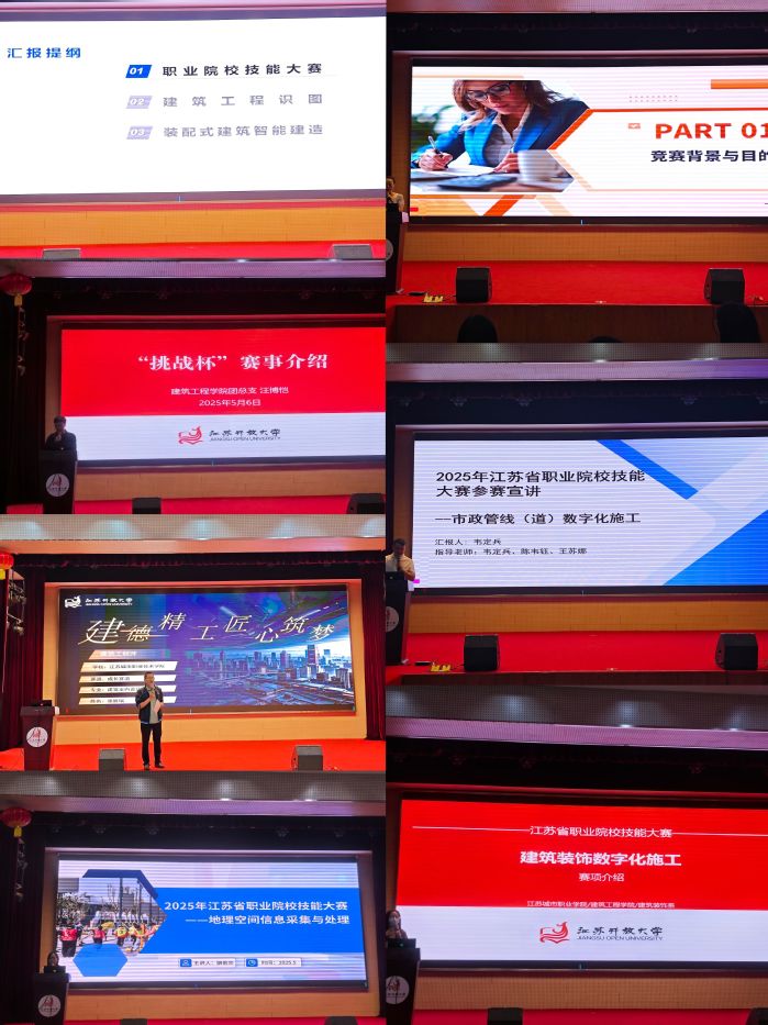 随后,学院各项技能大赛指导老师依次登台宣讲赛事。建工系张帆、工程管理系杨青、建筑装饰系吕宛容、建筑设备系韦定兵、实验实训中心骆莉莎分别对建筑工程识图、数字化计量与计价、装饰施工、市政管线施工及地理空间信息处理等大赛进行解读,通过赛事宣讲与备赛指导,为学生搭建从理论到实践,从课堂到行业的成长阶梯。学生工作办公室汪博恺、江胜锋两位老师则详细介绍了“挑战杯”与职业规划大赛的备赛要点,通过赛事联动、破题关键与往届案例,为学生提供备赛指导。