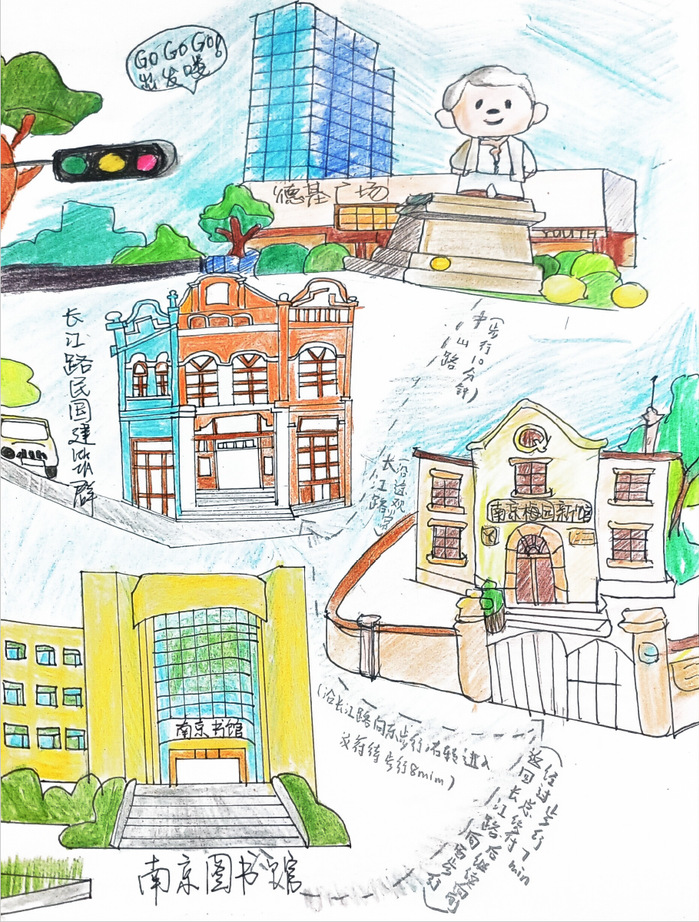 李文杰团队以《建筑可阅读,城市有记忆——红色基因与民国美学的时空对话》为主题,将长江路作为轴线,串联“红色革命”与“文化传承”双主题。从梅园新村纪念馆出发,通过手绘周恩来故居建筑立面、解析谈判文物,感悟统战智慧;在江苏省美术馆对比新金陵画派与西方艺术,解码画作中的革命符号;终站江宁织造博物馆以云锦模型拼装体验,揭示传统工艺振兴与文化自信的内在关联,建筑不仅是砖石,更是民族精神的载体。