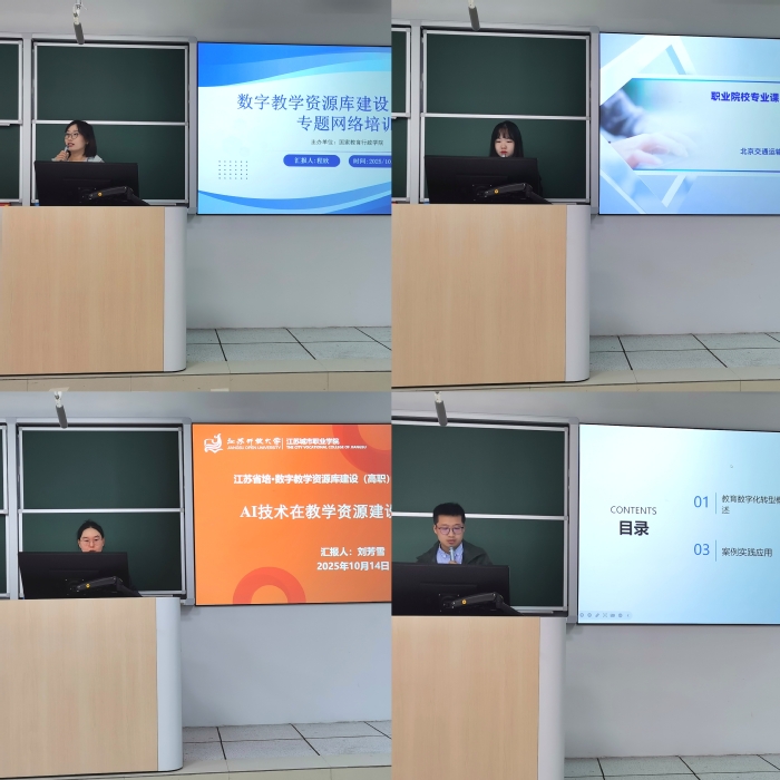 程欣、李紫玄、刘芳雪和赵峰4位教师参加了国家教育行政学院组织的“数字教学资源库建设(高职)专题网络培训”。本次培训以网络在线与互动研讨相结合的形式展开,内容丰盈,体系完整,从教育家精神的引领,到数字教材、资源库乃至智慧课程的宏观构建,为我们描绘了职业教育数字化转型的清晰蓝图。程欣老师着重从课程背景、数字教材建设历程和数字教材展示3个方面分享数字教材开发理念与技术的汇报。李紫玄老师主要从专业课实践教学资源主要内容、建设原则、建设方法、建设路径、建设目标、素材架构、核心要素、主要特征这8个方面汇报了职业院校专业课实践教学资源建设路径及方法。刘芳雪老师分享了AI技术在教学资源建设中的应用,并通过实例展示了如何借助AI技术打造高效演示PPT和利用AI助力教学微视频制作快速上手的动手操作。赵峰老师从教育数字化转型概述、转型背景下专业建设的做法和案例实践应用3个方面进行了汇报。4位教师表示参加此次培训,拓宽了专业教学与数字化深度融合的新视野,对优化高职数字教学资源建设有了更深刻的思考。