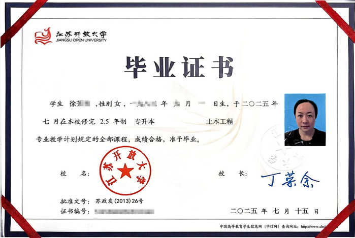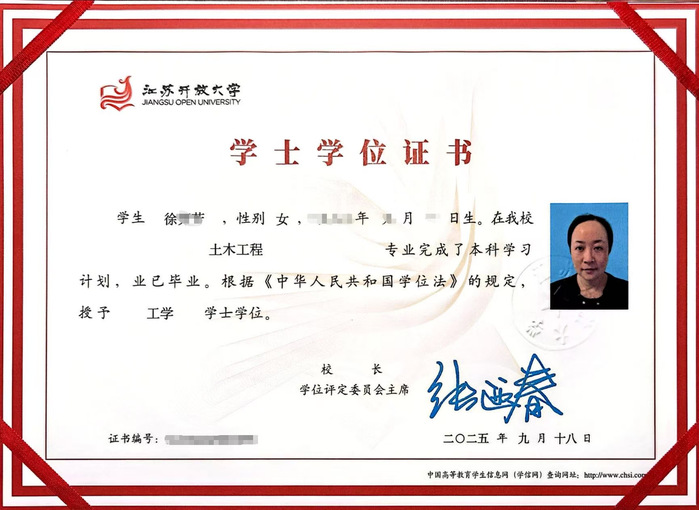 为了报考一级建造师,徐芳芳选择到江苏开放大学土木工程本科“回炉”。在这里,她遇到了一群“超龄”同窗:有转岗的工程师、有陪读的妈妈、有退休再出发的老人。老师们总在课后提醒“作业进度”,同学们在群内分享“工程制图技巧”。两年半的求学路,她不仅拿到了学位证书,更收获了“时间管理大师”的称号:清晨送娃、白天上课、夜晚辅导孩子加自学,连碎片时间都被她用来背单词、算力学题。而这张沉甸甸的学位证书,不仅圆了她投身建筑行业的职业理想,也成为她事业跃升的“钥匙”,让今日的坚持成为明日职业蓝图的新起点。