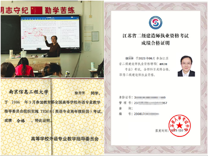 徐芳芳来自苏北农村,骨子里刻着“知识改变命运”的信念,凭着一股“小镇做题家”的韧劲,本科毕业于南京信息工程大学后考入南京大学攻读英语专业硕士,此后一直从事英语翻译与教培工作。从高中教资到雅思教培,从MTI考研辅导到国家二级笔译课程,20年执教生涯里,她执教的K12学科英语、专转本英语通过率超80%,成为家长口中的“提分锦鲤”。更令人惊叹的是她的跨界学习能力——考取江苏省二级建造师(市政/建筑双专业)、攻读江苏开放大学土木工程本科,将“文科生”的标签撕得粉碎。当人们惊叹于她的“多面手”时,她只说:“学习是刻进DNA的本能。”