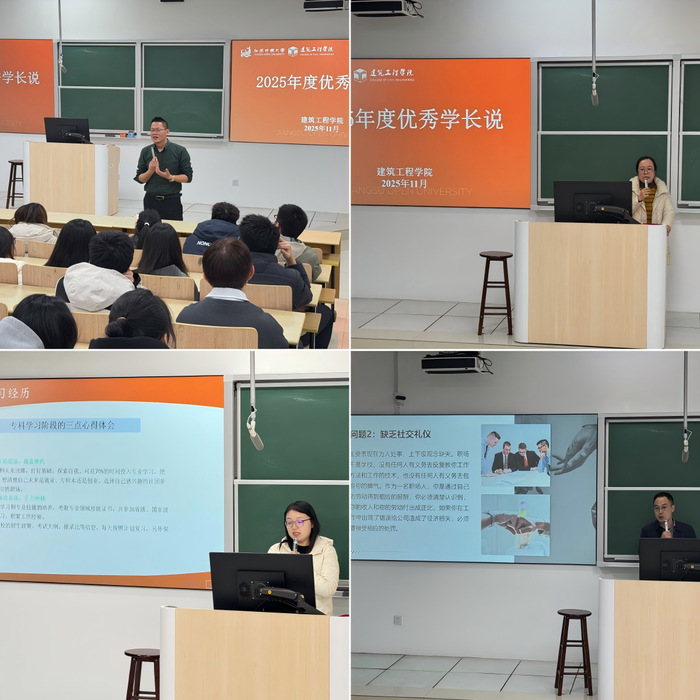 为充分发挥优秀校友的示范引领作用,帮助在校学子明晰学业规划与成长路径,建筑工程学院于2025年11月25日晚在应天校区教学楼201教室成功举办“优秀学长说”主题分享会。24、25级全体班团委及团学社主要学生干部共120余人参与活动。会议由院学工办主任江胜锋老师主持。