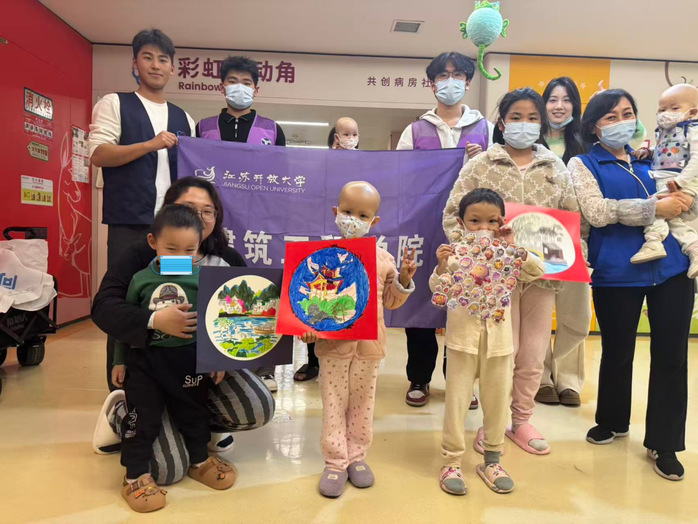 2025年12月12日,建筑工程学院4名学生志愿者走进南京市儿童医院肿瘤科,为住院儿童带来一堂《干栏建筑里的生态智慧与民族故事》主题文化课,用传统建筑、民族建筑之美点亮童心,共绘国风未来。