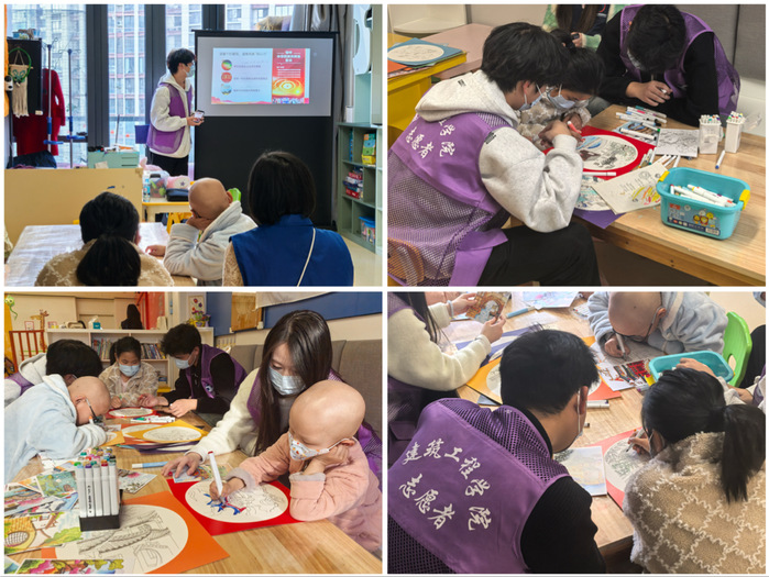 2025年12月12日,建筑工程学院4名学生志愿者走进南京市儿童医院肿瘤科,为住院儿童带来一堂《干栏建筑里的生态智慧与民族故事》主题文化课,用传统建筑、民族建筑之美点亮童心,共绘国风未来。