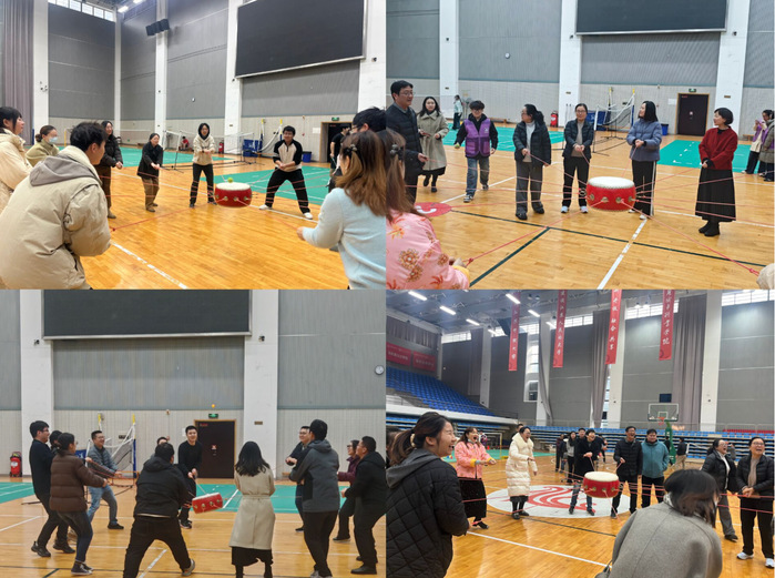 比赛现场热闹非凡,欢声笑语此起彼伏。教职工们迅速投入状态,在各个项目中各展所长:滚铁环时,大家屏气凝神,稳稳操控铁环向前滚动;跳绳场上,身影轻盈跳跃,节奏明快有序;同心鼓旁,10 人一组的队员们齐声喊着节拍,双手同步发力,小球在鼓面上轻盈起落,呐喊声、鼓点声与欢呼声交织在一起,充分展现了团结协作的强大力量。无论是个人项目的奋勇争先,还是团队项目的默契配合,都彰显了教职工们积极进取、互帮互助的精神风貌。