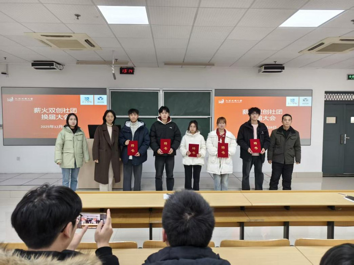12月26日中午,我校薪火双创社换届大会在应天校区教学楼101室隆重举行。建筑工程学院党总支副书记徐亚、社团指导教师宋智华、孔萌,以及社团成员齐聚一堂,共同见证社团发展历程中的重要节点。