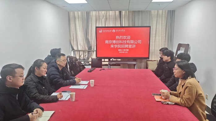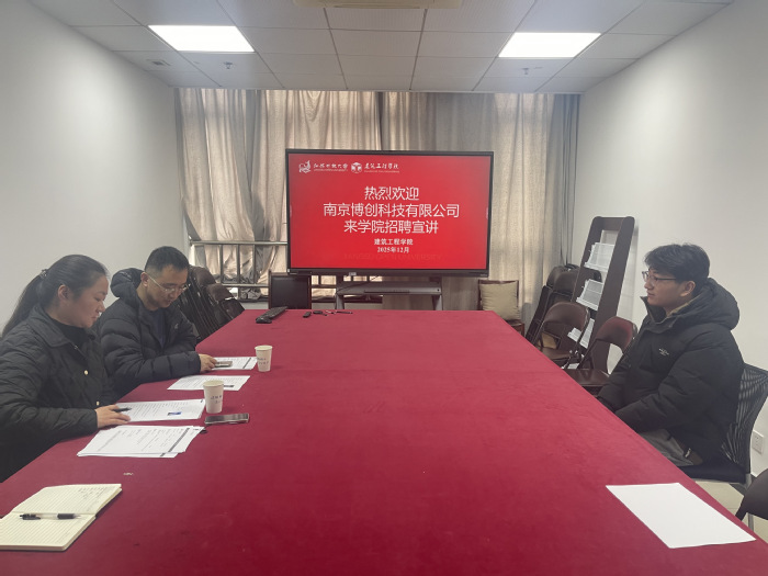 2025年12月31日上午,建筑工程学院与南京博创科技有限公司携手打造的专场招聘面试活动在学院会议室圆满举行。本次活动以“深化产教融合、精准对接需求”为核心目标,通过“面对面选拔+零距离指导”的创新形式,为6名建筑设备系学子搭建直通企业的就业桥梁,学院党总支副书记徐亚携建筑设备系主任韦定兵、两位班主任蒋玉龙、孙陈橙参与组织,企业方由总经理王海波、副总经理王素娟率队出席,彰显了校企协同育人的生动实践。