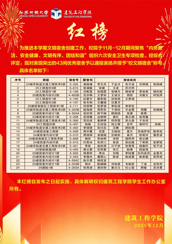 建筑工程学院11月-12月优秀宿舍“流动红旗”榜