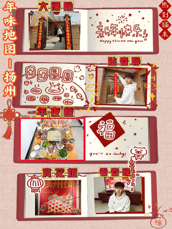 25建筑智能化工程技术1班王毓萱同学则以笔墨寄情,亲手绘制家乡“年味地图”,将元宵、饺子、舞狮等新春元素与民俗寓意一一收录,用手账定格家乡的新春烟火气,让乡土情怀在笔尖流淌。