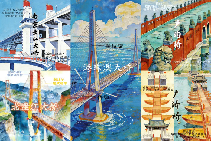 25建筑室内设计2班葛贝希紧扣科技热点,用AI工具设计创意海报传承建筑文化,她聚焦国内五大著名大桥,用年轻化方式展现桥梁建筑之美,为建筑文化传承注入科技活力。