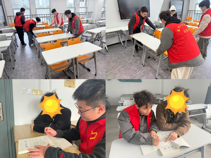男生志愿者奔赴教学楼区域,逐一规整教室内歪斜桌椅,打造干净舒适的学习空间;同时化身“学业帮扶员”,为即将参加补考的同学梳理专业知识点、答疑解惑。建工系第二党支部副书记严旺、团总支书记刘鑫全程参与指导,带头投身志愿服务,以实际行动带动青年学子践行奉献精神。