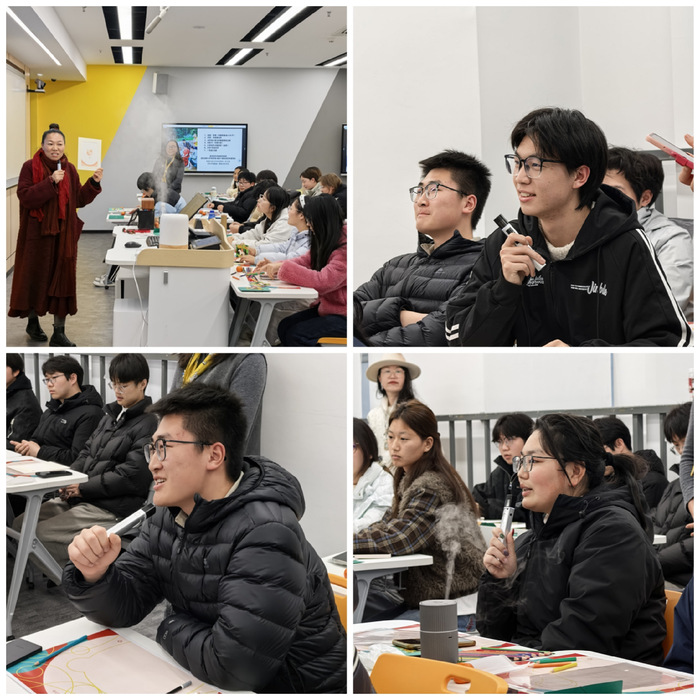 随后,段老师带领同学们开启了一场沉浸式六感疗愈之旅。活动以嗅觉为切入点,在野橘精油的清新香气中,同学们跟随引导闭目冥想,让纷乱的思绪慢慢沉淀,在全然放松的状态下,与自己的内心感受深度联结。冥想结束后,大家拿起画笔,将脑海中浮现的画面、心底蕴藏的情绪,自由挥洒在画纸上:有人画下与家人相伴的温暖瞬间,诉说着心底的柔软与思念;有人勾勒出关于未来的美好图景,藏着对成长的期许与向往;也有人用抽象的色块与线条,描摹当下最真实的情绪,或沉静舒缓,或热烈飞扬。段老师逐一选取画作进行点评引导,邀请创作者分享创作背后的心声,每一幅画作都是一次真诚的情绪表达,每一次分享都是一场温暖的心灵释放。