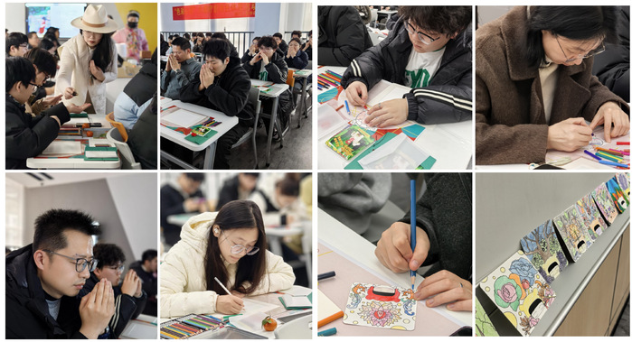 活动进入涂色卡深度体验环节,同学们挑选心仪的涂色卡,在舒缓的氛围中静心涂色,在一笔一画间继续与内心对话,让情绪在色彩中慢慢舒展。涂色完成后,段老师将所有作品集中展示,引导同学们尝试解读他人的画作:有人从明快的色彩搭配中读出了创作者的喜悦与松弛,有人从细腻的笔触里感知到对方的温柔与坚定,也有人在厚重的色块中读懂了未曾言说的情绪。在你来我往的解读与交流中,同学们既看见了他人作品里的美好与真诚,也在他人的视角中重新认识了自己,在双向的共情与理解中,拉近了心灵的距离,收获了温暖的力量。