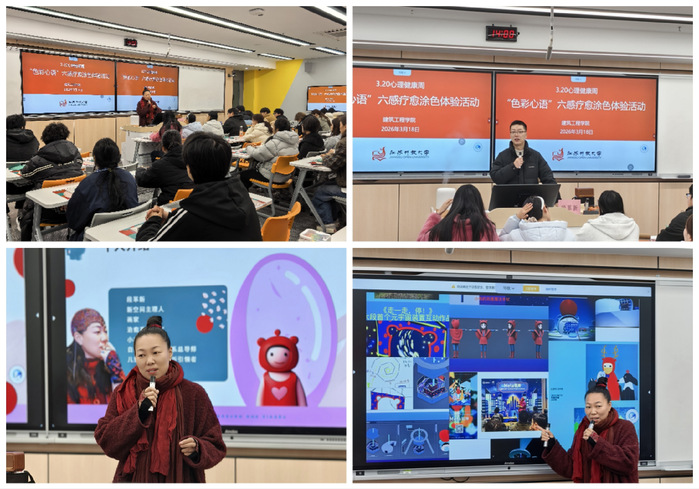 为深入落实立德树人根本任务,扎实推进大学生心理健康教育工作,迎接2026年江苏省高校“3・20 咱爱您”心理健康周,引导学生在艺术浸润中舒缓情绪压力、提升自我觉察能力,3月18日下午,建筑工程学院在应天校区教学楼208 教室举办 “绘心色彩 愈见自己 ——‘色彩心语’六感疗愈涂色体验活动”。活动特邀治愈艺术家段革新老师主讲,学院党总支副书记徐亚、全体辅导员,以及各班心理委员、班长和兄弟学院学生代表共 60 余人参与沉浸式体验,活动由辅导员汪博恺主持。