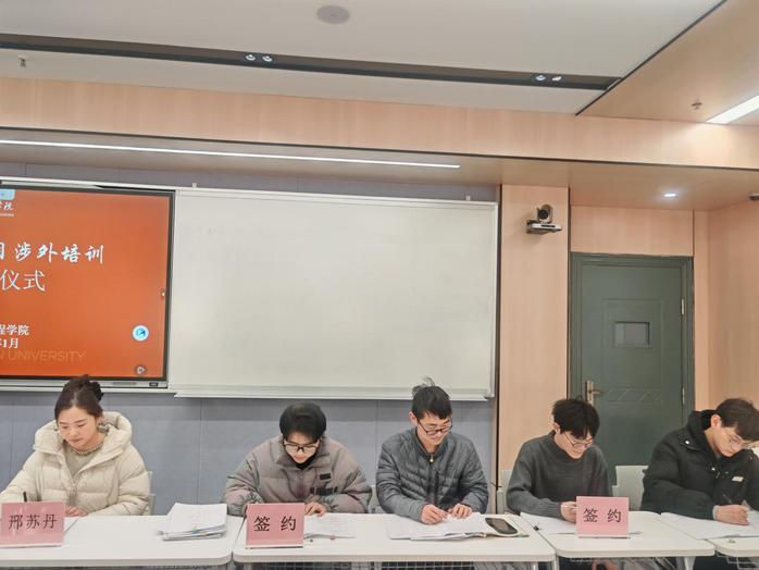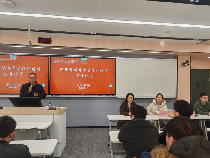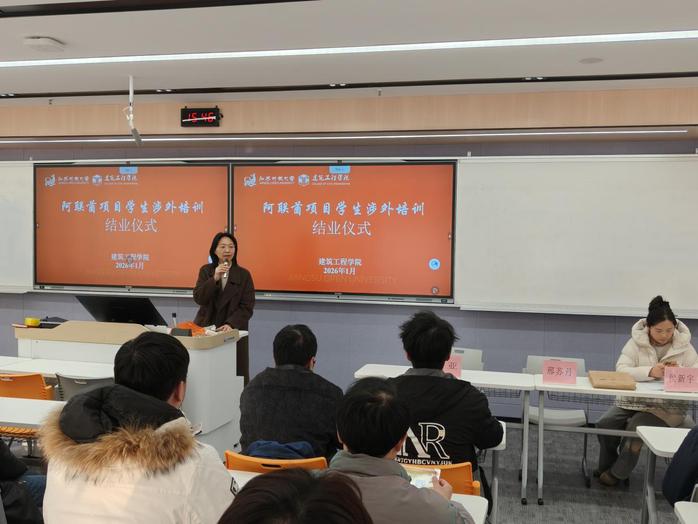 1月24日下午,建筑工程学院教学楼206教室内气氛热烈,一场特殊的结业仪式在这里举行。随着学院领导与企业代表共同见证,13名优秀学子正式结束为期两周的阿联酋项目岗前涉外培训,并现场签订就业协议,即将跨越山海,于春节后奔赴阿联酋项目建设一线。这是我院继2023年、2024年后,第三批选派学生赴海外就业,标志着学院国际化人才培养迈出了更坚实的一步。